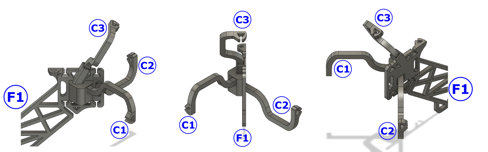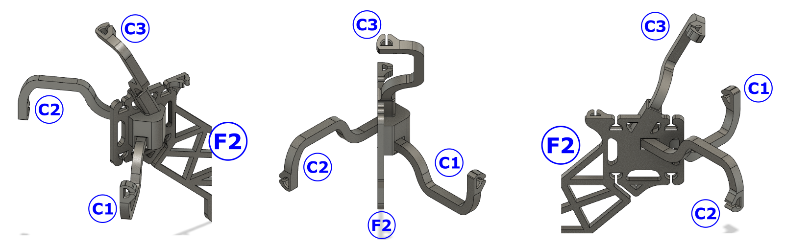 Insert connectors C1, C2, and C3 into the foot F2: